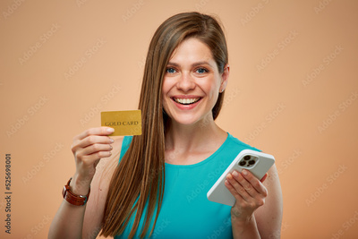 Smiling woman holding credit card and smartphone, isolated portrait on yellow brown background.