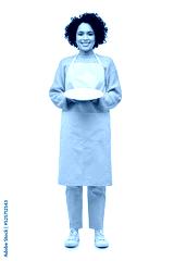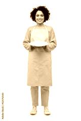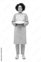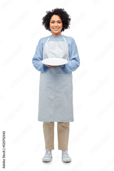 cooking, culinary and people concept - happy smiling woman in apron holding clean empty plate over white background