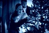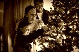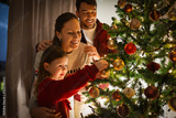 family, winter holidays and people concept - happy mother, father and little daughter decorating christmas tree at home