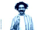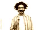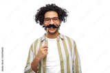 party props, photo booth and people concept - smiling young man with mustache accessory over white background