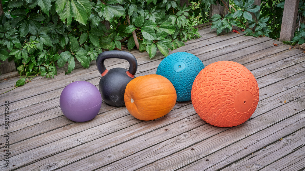 three heavy slam balls, iron kettlebell and pumpkin on a backyard deck, home and backyard gym concept, late summer or fall scenery
