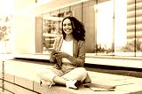 Joyful beautiful successful young mixed race woman, wearing stylish clothes, sitting outdoors, using her smartphone, chatting on social networks, browsing websites, looking at the camera, smiling