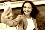 Lovely positive curly haired hispanic or brazilian young woman standing outdoors, taking a selfie on her smartphone, mixed race female blogger having live streaming on social network, smiling