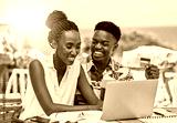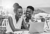 Happy couple online shopping with laptop and credit card payment on ecommerce website with a smile during vacation. Man and woman buy on the internet or pay bills, tax and finance while in summer