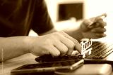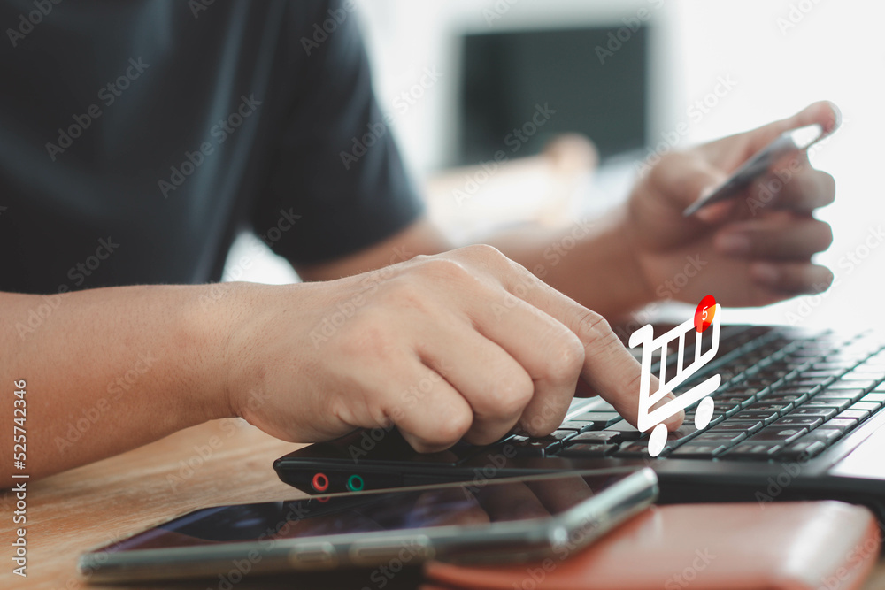 Online shopping concept. Hand holding credit card and using laptop. Businessman or entrepreneur working from home. Online shopping, e-commerce, internet banking, spending money, work from home concept