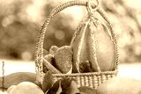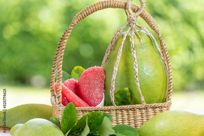 Pomelo fruit in wooden basket on blur garden background, Red Pomelo fruit with slice in wooden basket.