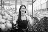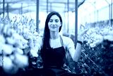 Pretty women relaxing among flowers while sitting in a meditation pose in the green house