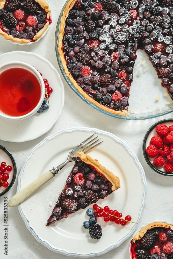 Delicious homemade piece on a plate and the whole homemade forest berry tart