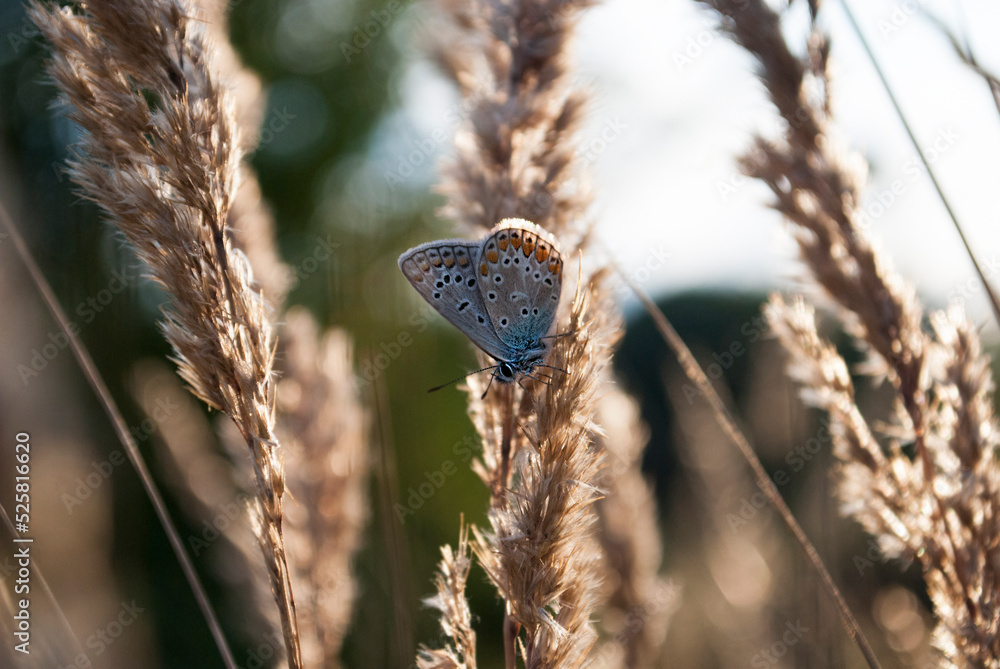 A small butterfly common blue sits on a spikelet of grass. Nature background