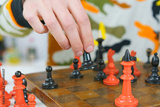The man's hand above a chess board makes a move. Defense. Planning. Plan. Squares. Tactic. Effort. Tactics. Solution. Maneuver. Step. Action. Trick. Way. Method. System. Black