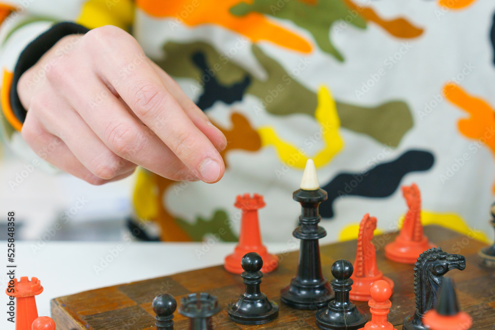The man's hand above a chess board preparing to make a step. Defense. Planning. Plan. Squares. Tactic. Effort. Tactics. Solution. Maneuver. Step. Action. Trick. Way. Method. System. Red