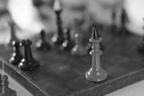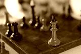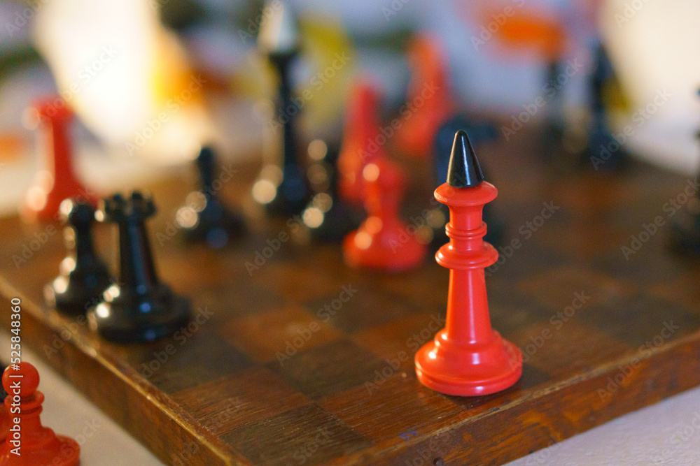 Side view of an old wooden chess board with red and black chess pieces. Black king chess piece. Planning. Plan. Squares. Tactic. Effort. Tactics. Solution. Maneuver. Step. Action. Trick. Way. Method