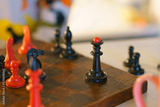 Side view of an old wooden chess board with red and black chess pieces. Black queen chess piece. Planning. Plan. Squares. Tactic. Effort. Tactics. Solution. Maneuver. Step. Action. Trick. Way. Method