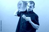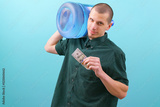 Man holding a gallon of water on his shoulder and shows 100 dollars in his hand on a blue background. Water. Delivery. Gallon. Home. Man. Bottle. Paying. Pays. Earnings. Dollar. White label