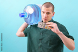 Man holding a gallon of water on his shoulder and shows 100 dollars in his hand on a blue background. Courier. Smile. Bottled. Drink. Heavy. Shoulder. Uniform. Male. Cheerful. Jug. Fresh. Arm