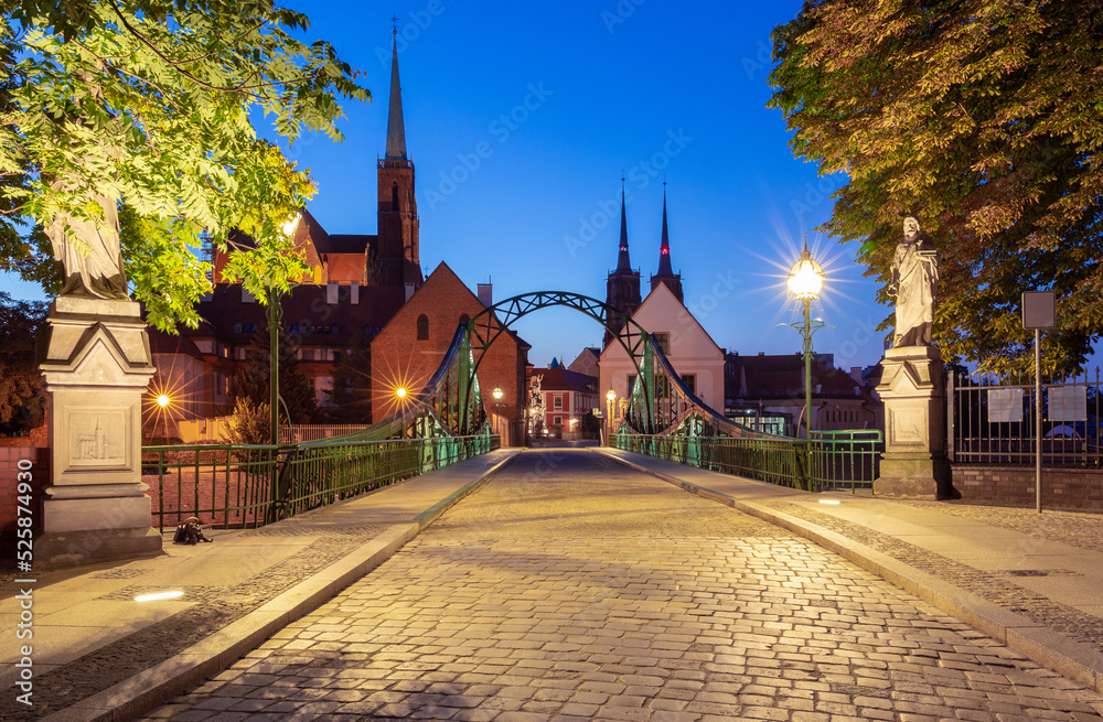 Wroclaw. Old iron bridge to Tumsky island at dawn.