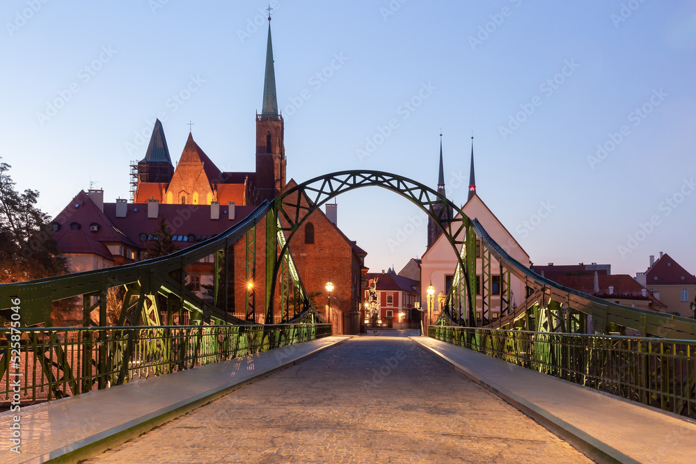 Wroclaw. Old iron bridge to Tumsky island at dawn.