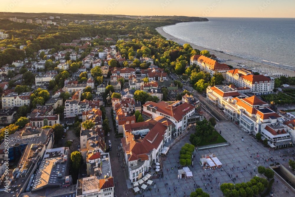 Aerial view of Sopot and the buildings of the seaside village. A warm summer afternoon creates a pleasant atmosphere in the photo.