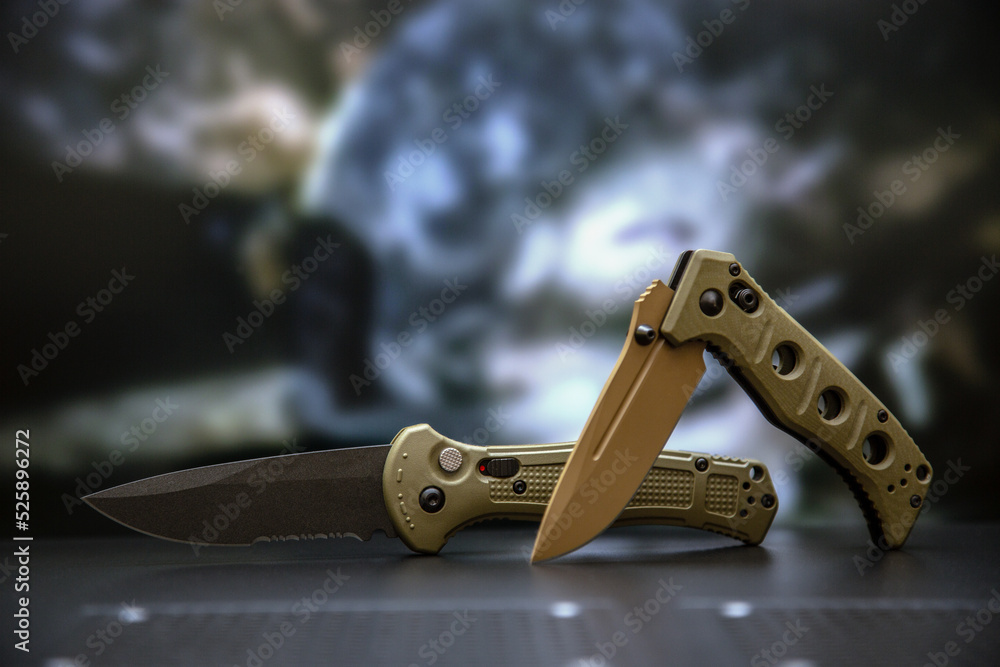 Khaki military pocket folding knives. Compact metal sharp knife with a folding blade. Blurred back.