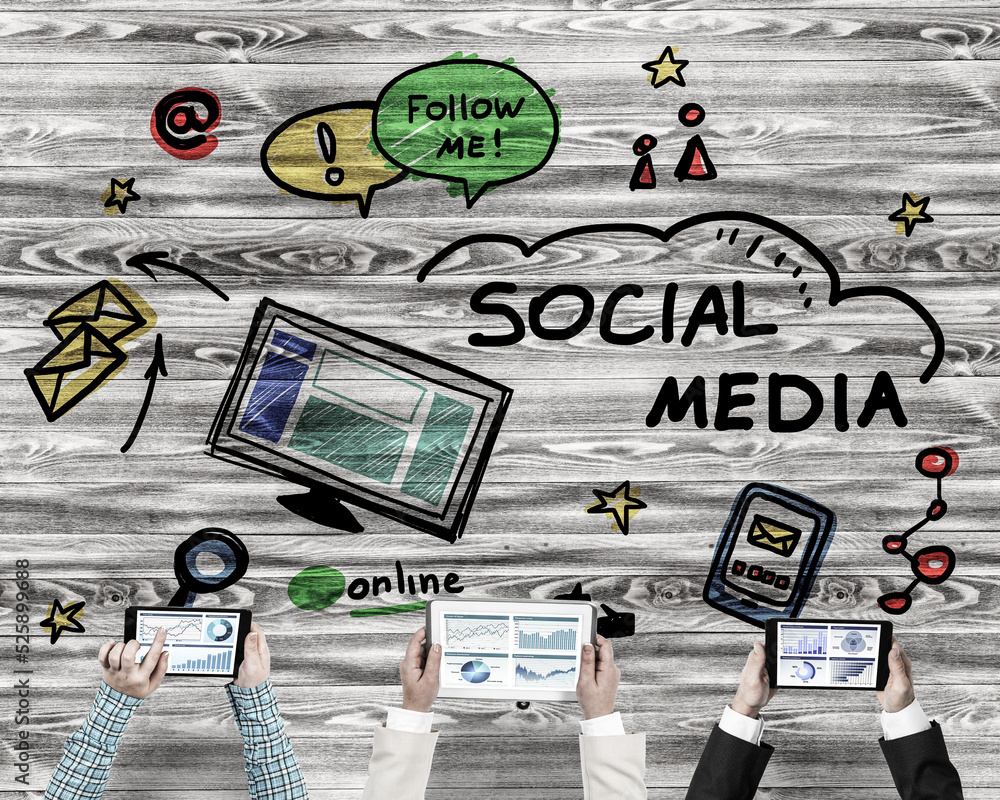Top view of businesspeople sitting at table and using gadgets