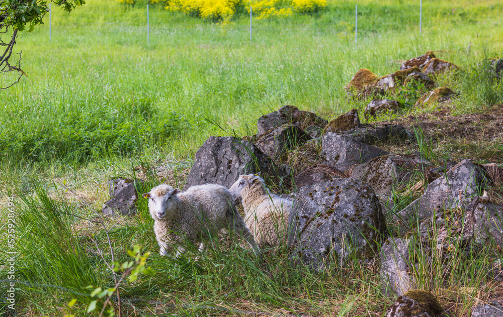 Beautiful view of two white sheep resting near rocks on green pasture on bright summer day.