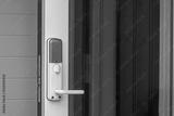 Close up view of digital lock on white entrance door. Modern technology concept.