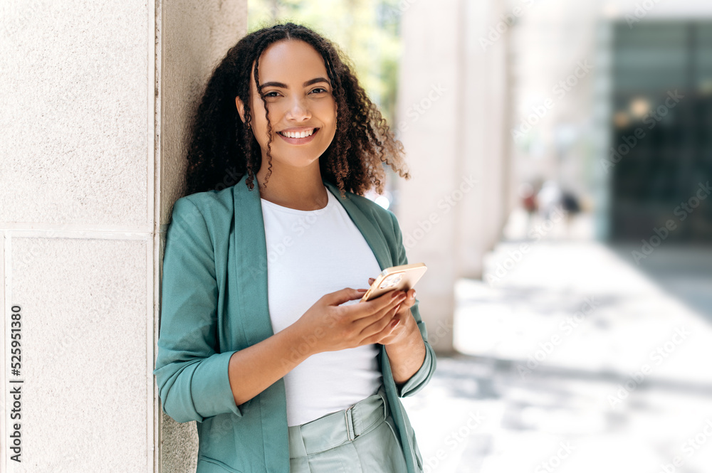 Online messaging.Happy gorgeous pretty mixed race young woman, with curly hair, stylishly dressed, using her smartphone, stand outdoors, chatting with friends on social networks, looks at camera,smile