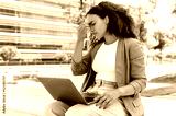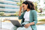 Stress, problems at work. Tired mixed race young business woman, sitting outdoors with a laptop near the business center, massaging the bridge of the nose, experiencing headache, migraine, overwork