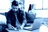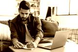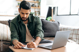 Concentrated clever indian or arabian guy, student or freelancer, sitting at home on sofa in living room, using laptop, working or studying remotely, listening to webinar, taking notes, homework