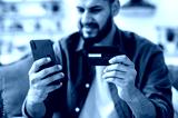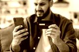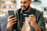 Defocused indian or arabian attractive guy, sit on a sofa in the living room, using a bank card and a smartphone, making online purchases, making payments, ordering delivery. Online shopping, payment