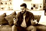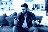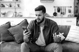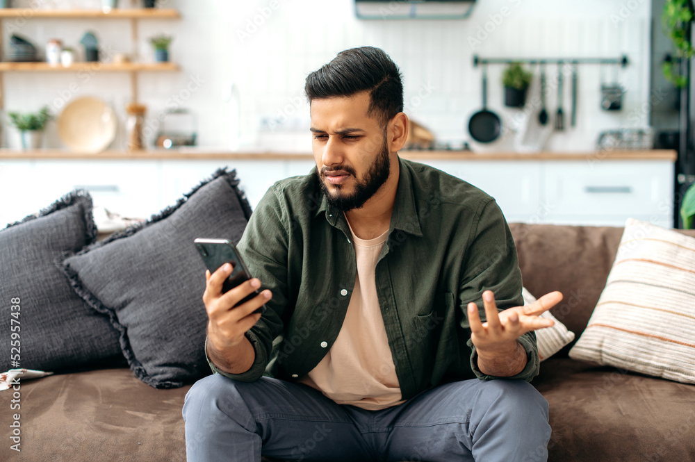 Disappointment puzzled mixed race young man in casual wear, sits on sofa in living room, using mobile phone, texting online, browsing social networks, reads news, looks at screen in confusion, stunned