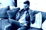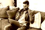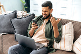Positive mixed race young man in casual clothes, spending time at home, sits on the sofa in the living room, using a smartphone, read unexpected news, browsing the internet, social networks, smile