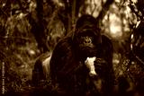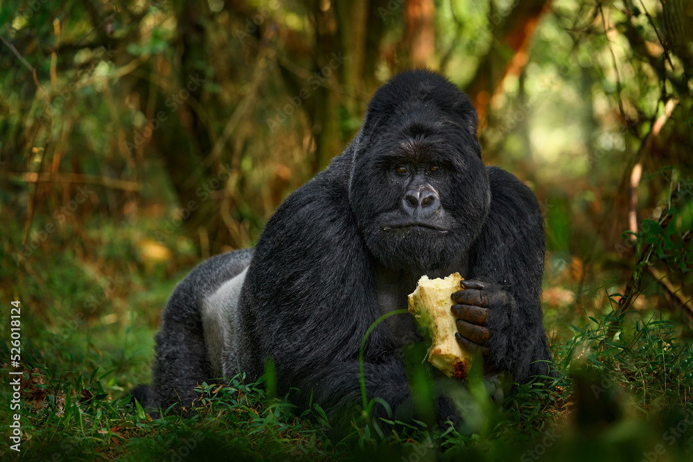 Uganda mountain gorilla with food. Detail head primate portrait with beautiful eyes. Wildlife scene from nature. Africa. Mountain gorilla monkey ape, Bwindi NP. Gorilla - wildlife forest portrait.