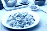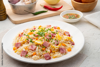 Thai Fried rice with egg and sliced ham carrot in white plate.Easy cooking food