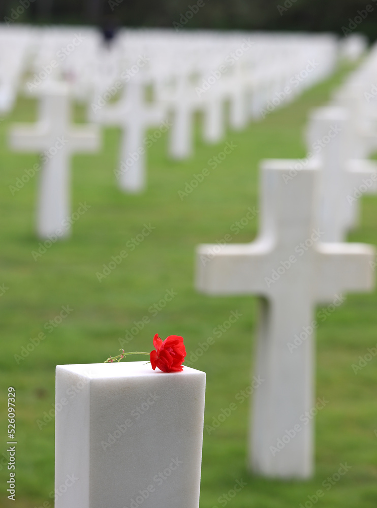 red rose on the cross of a cemetery of soldiers who died during the Second World War