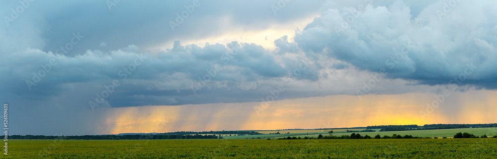 Summer rural panoramic landscape with dark rainy clouds over the fields