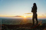 woman traveler drinks coffee with a view of the mountain landscape