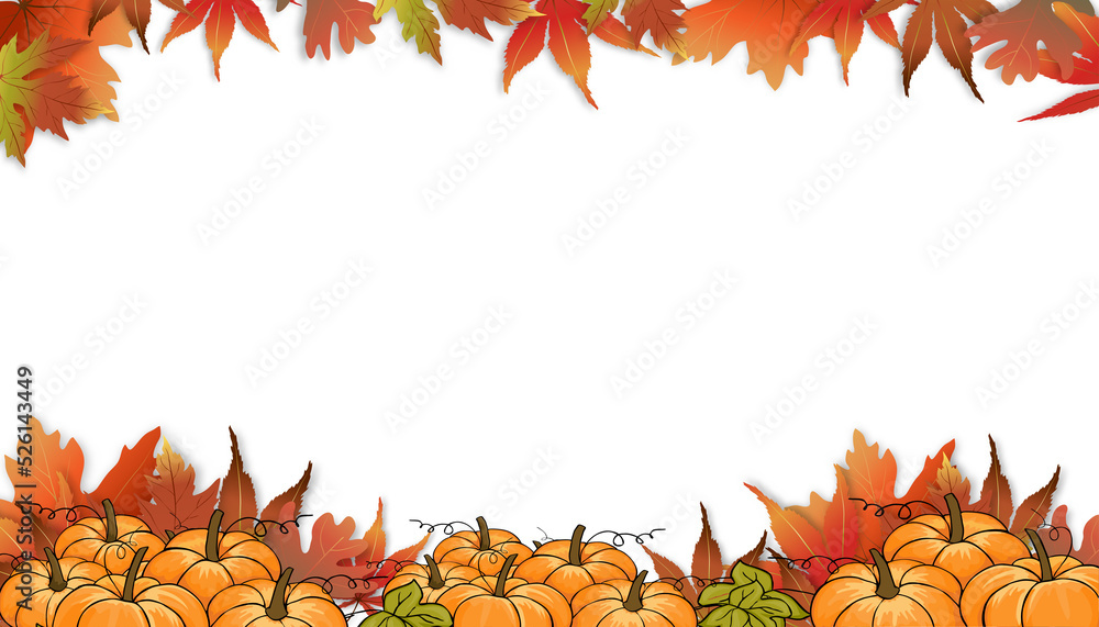 Autumn background with pumpkin and maples leaves border, Fall template design with multicolour of leafs for Harvest festival background, Vector leaves frames with copy space for Thanksgiving festival