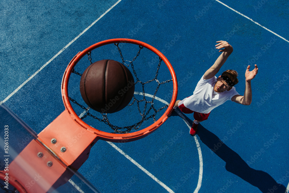 top view of ball in basketball ring and young man training on court