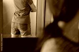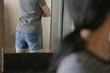 Women look at her pants with period blood spot stains on mirror with blur background. Need to be cleaned.