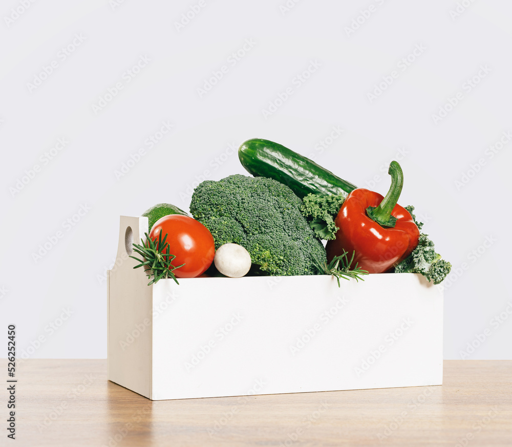 Fresh green and red vegetables in a box on a wooden table. Banner with copy space. Green vegetarian diet or cuisine. Grocery delivery or shopping online. Green diet