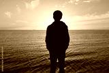 a man stand in front of sunset over the sea with warm blue sky. Looking for passion or future. thinking of life.