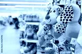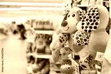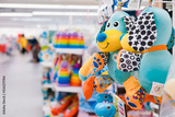 Shop toy store for babies. A soft toy close-up on a shopping trip with a blurry background.