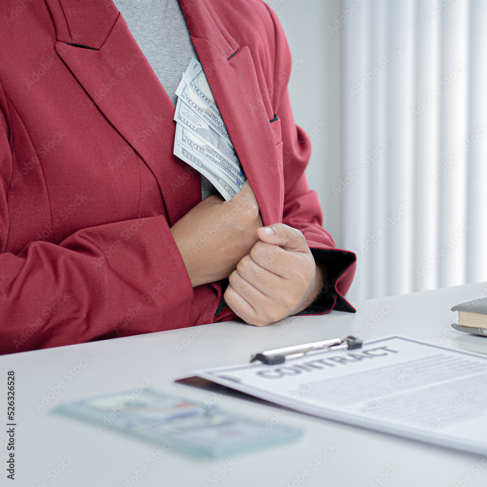Businessmen give dollars to bribe employees in signing contracts to buy illegal land and real estate, Business fraud and social injustice, corruption and bribery concept.