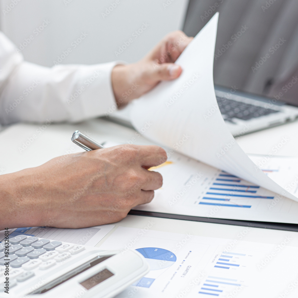 Marketing businessmen are analyzing financial and insights strategies for generating revenue including corporate income tax with laptops and graphs in the office, Finance and Accounting concept.