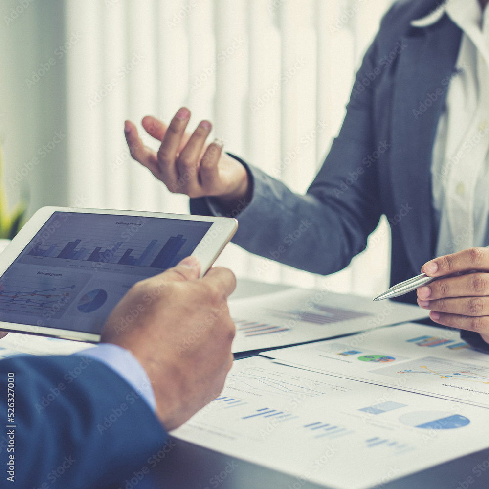 Brainstorm team, Marketers and financial accountants are discussing and analyzing charts to plan strategies to meet customer needs, Tablet technology for business concept.