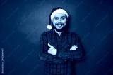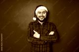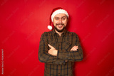 portrait of a smiling happy man in a Christmas hat, casual clothes with his arms folded in front of him is isolated on a red studio background with an empty space for text. concept - people, holidays