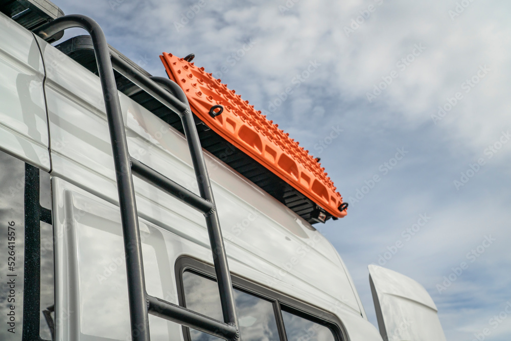 detail of 4x4 camper van with a ladder, roof racks and recovery ladders