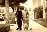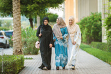 Arabic women wearing traditional abaya dress meeting and having fun in Dubai - Happy beautiful muslim females bonding outdoors in the city