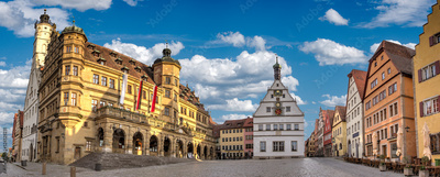 Der zentrale Marktplatz in der historischen Altstadt von Rothenburgg ob der Tauber mit seinen historischen Gebäuden bei sonnigem Wetter und aufgelockerter Bewölkung